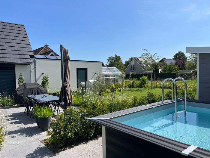 Verder biedt de tuin verschillende plekken om te genieten: een knusse loungezone bij het water voor rust en verkoeling, en een royale pluktuin en moestuin rond de elegante kas voor iedereen die graag buiten bezig is. Door de heldere structuur en het aangename groene decor voelt de tuin ruim, rustig en verfijnd—een buitenruimte die precies aansluit bij het dagelijks leven van de bewoners en uitnodigt om elk seizoen opnieuw te beleven.